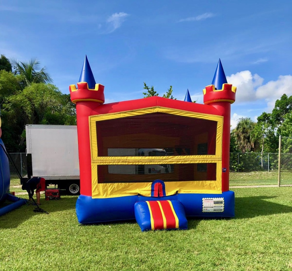 Treat your favorite Prince like royalty at their next party in our Lucky Multicolor Castle bounce house. This item does include a basketball hoop inside.