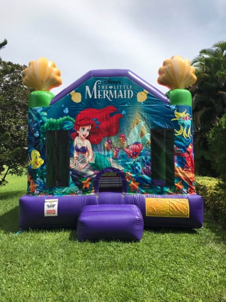 This Little Mermaid bouncehouse brings Ariel and friends back under the sea, and your guests can come along! This bounce house boasts artwork of Ariel, Flounder, Sebastian, and other friends from the sea floor, with King Triton's castle nearby. Kids can jump away the day with everyone's favorite rebellious mermaid, or pretend they're swimming through an exciting shipwreck! This Little Mermaid moonwalk is a great way to promote an entertaining form of fitness for kids. This bounce house is sure to bring smiles to all eager bouncers!