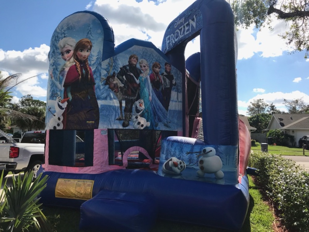 Just like any good fairy tale, this wildly popular Frozen inflatable bounce house rental dry combo delivers obstacles and happy endings forever after. Princesses and friends can bop and romp inside the spacious castle tackling log and pop-up obstacles. Or, they can chill out playing some hoops in the winter wonderland. A quick climb up North Mountain allows a clever escape down the slide from any danger lurking in the land. Parents and other spectators will be able to “Let Go” as they enjoy watching the fun safely unfold through the clear, 360-degree mesh sides. Reserve early—this model is quite popular!